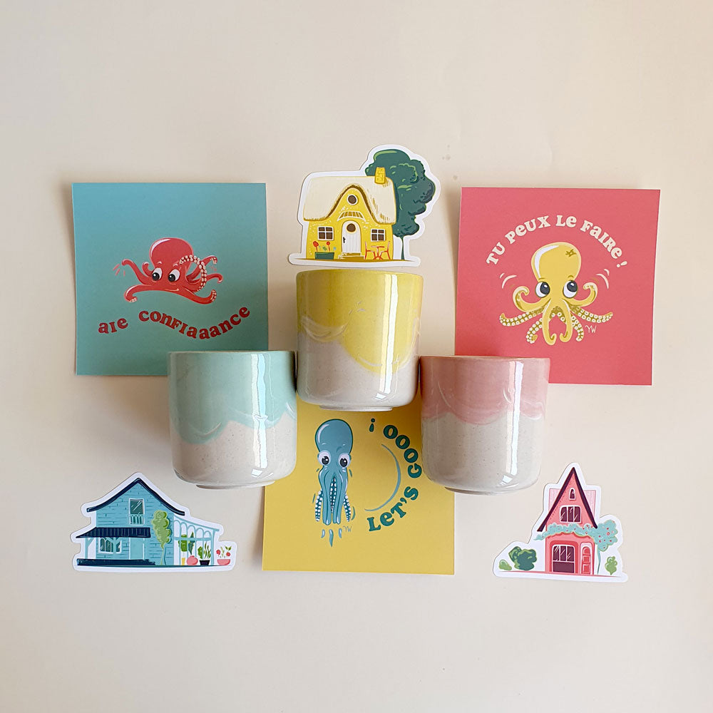 Carte carrée à message motivant, format idéal pour la poser sur un coin de bureau, la glisser dans un carnet, l’afficher sur le frigo. Motif poulpe jaune “tu peux le faire” sur fond corail.
