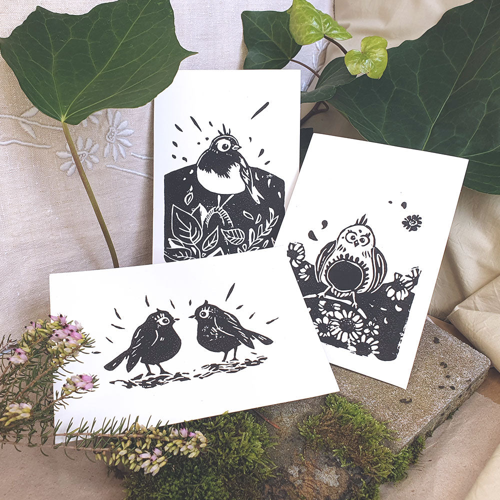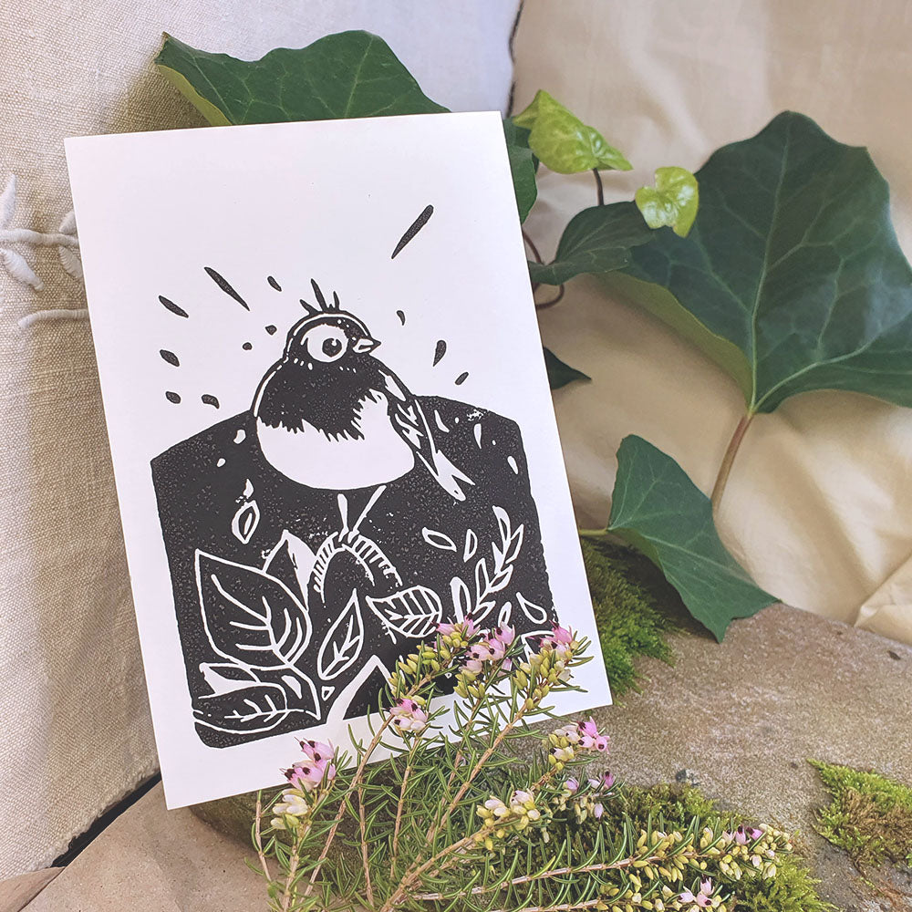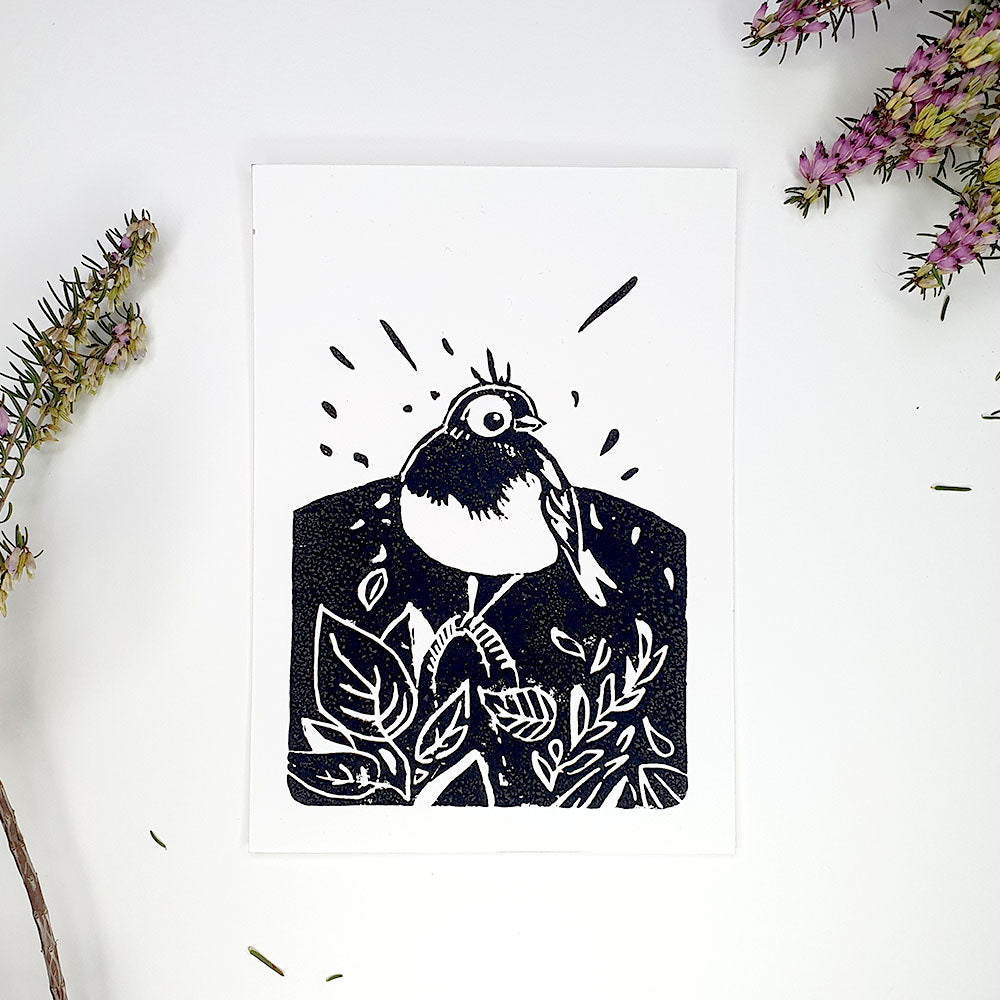 Linogravure oiseau feuillage