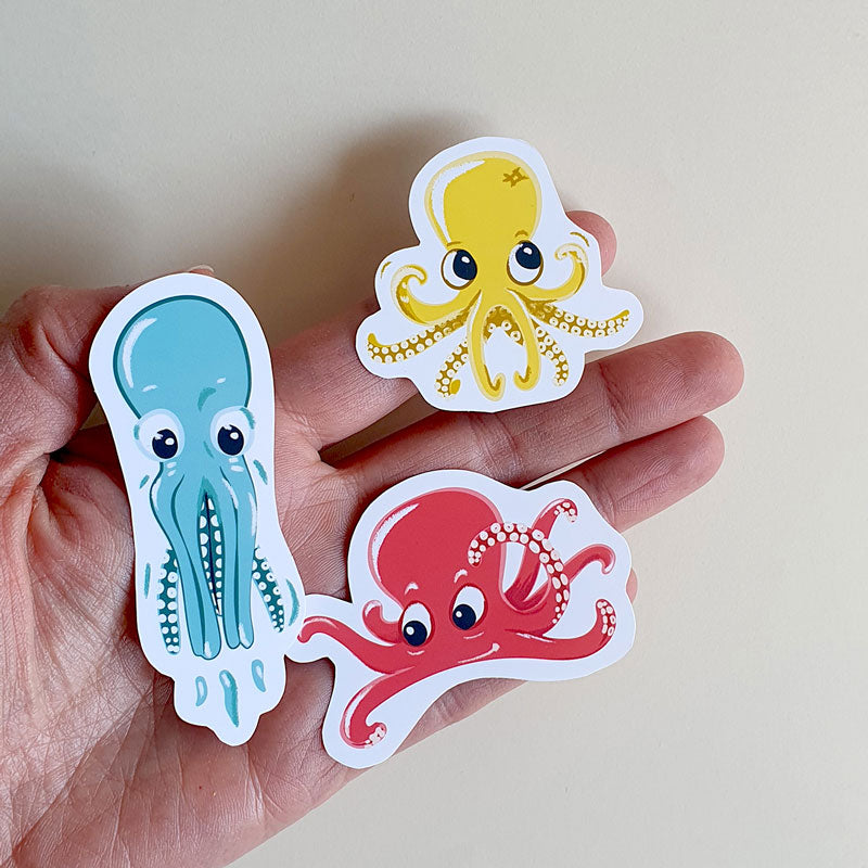 Lot de 3 stickers motifs poulpes en couleur : corail, vert, jaune.